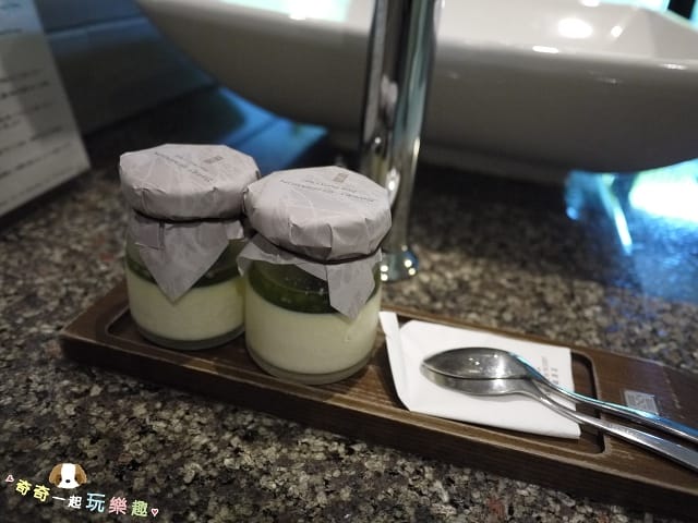 小點心是紅豆抹茶奶酪,木製小托盤,