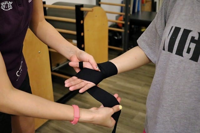 為了保護手腕,戴上拳擊手套前會先作好防護措施,