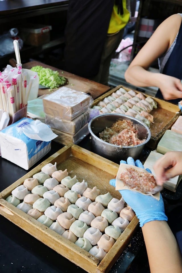 最喜歡看現場包餛飩了,以蔬菜製作的三色大餛飩皮,