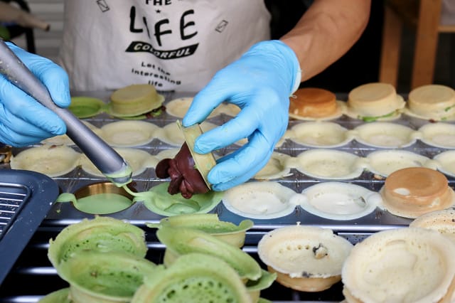 雙餡的紅豆餅餅皮是抹茶口味的,還會印上LOGO,