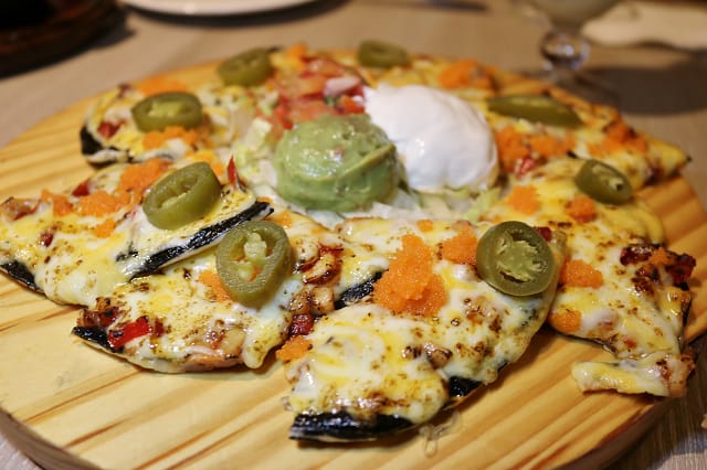 好像來The chips的人大多會點漢堡,可這天我就想吃別的,覺得火烤烙餅看起來更吸引我,黑黑的墨魚醬其實沒有特別的味道,鹹鹹辣辣又甜甜的日式風味,嘴裡逼逼啵啵的明太子,QQ的章魚,墨西哥辣椒好加分,滿滿牽絲起司好香好誘人,像是薄餅PIZZA,非常好吃!!